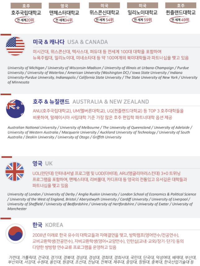 말레이시아에서 기본기를 다지고 실제 서구권 대학에 가서 수업을 들을 수 있는 장점이 있습니다. 편입학이 가능한 파트너 학교들은 아래와 같습니다.