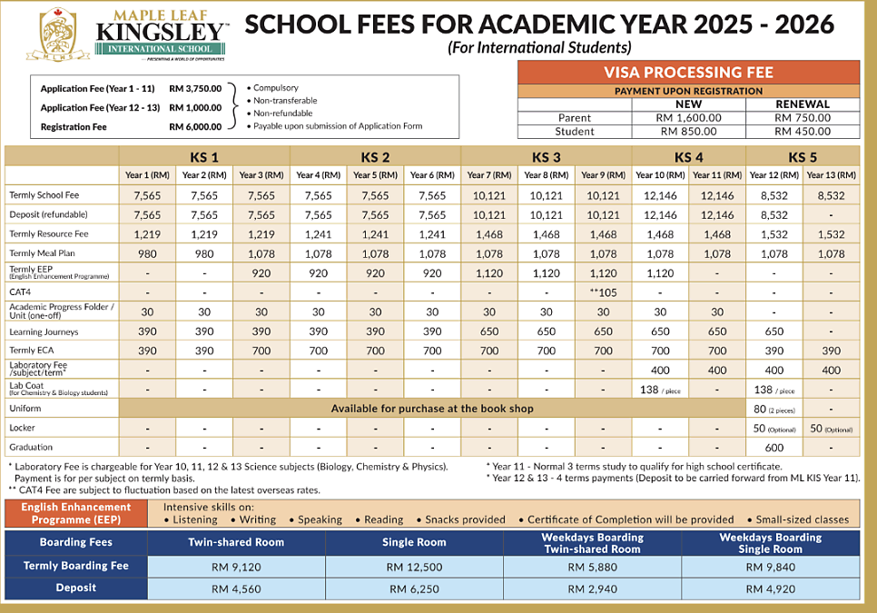 기숙사는 만 10살 부터 입실 가능하며, 1인실과 2인실의 옵션이 있습니다. 기숙사에서 지내는 학생들이 집처럼 편하게 지낼수 있도록 생일파티, 저녁파티, 스포츠 활동, 요리체험, 수학여행, 말레이시아 여행 등 다양한 활동을 제공하고 있습니다. 또한 24시간 아이들의 안전을 지켜주는 사감선생님, 방과 연결된 화장실, 모든 식사 제공, 세탁 서비스, 와이파이, 헬스장 등의 시설들이 제공 되고 있어 아이 혼자 유학을 보내는 경우에도 안심 하실 수 있을것 같습니다.