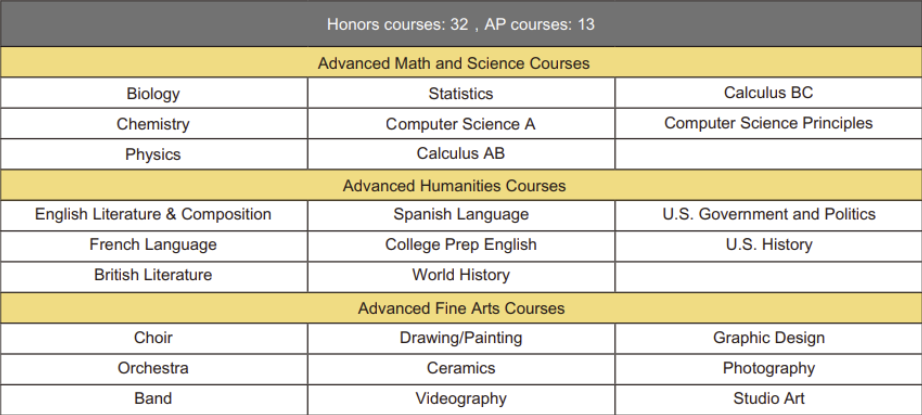 2023년도 기준, 11학년과 12학년 학생 75명이 13종류의 과목으로 총 138개의 AP 시험을 치렀습니다.