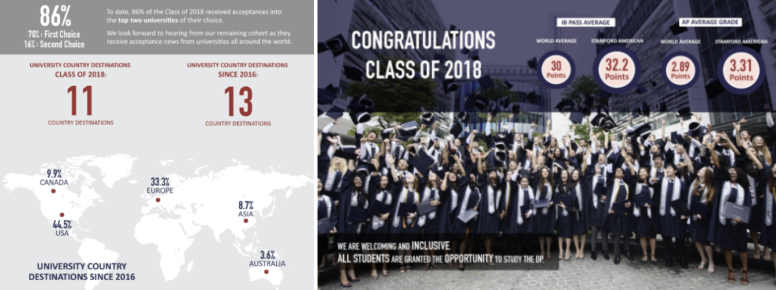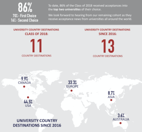훌륭한 커리큘럼을 베이스로 아주 저학년 때부터 졸업까지 다국어 교육과 , 학생들의 대입와 진로를 위해 여러 교육옵션을 제공하고 있습니다. 따라서 대학 진학시에 싱가폴 내의 명문대학 외에도 미국, 영국 등의 세계 각국의 명문대로의 진학률이 높습니다.