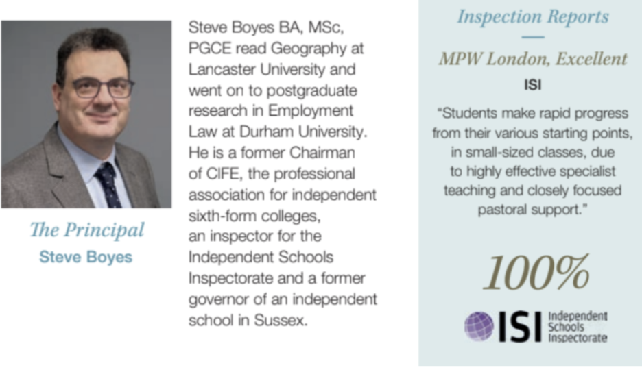 MPW 런던의 학교장인 스티브 보이스는 랭커스터 대학에서 지리학 학사 학위를 취득하고, 그 후 더러브 대학에서 고용법 분야의 대학원 연구를 수행했습니다. 그는 독립 6학년 칼리지 전문 협회인 CIFE의 전 의장이며, 독립 학교 감사 기관(ISI)의 감사원이자 사설 스서지 주에 위치한 독립 학교의 전 이사입니다.