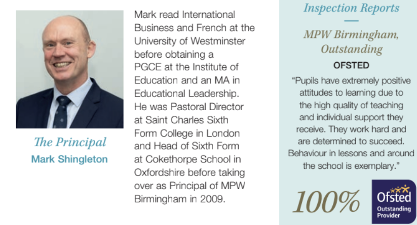 MPW 버밍헝의 학교장인 Mark는 웨스트민스터 대학에서 국제 비즈니스와 프랑스어를 전공한 후, 교육원에서 PGCE를 취득하고 교육 리더십 석사 학위(MA)를 획득했습니다. 그는 런던의 세인트 찰스 식스폼 대학에서 교우지도 책임자(Pastoral Director)로 근무한 뒤, 옥스퍼셔의 코크토프 스쿨(Cokethorpe School)에서 식스폼 담당자로 일한 경험이 있으며 이후 2009년에 MPW 버밍엄의 교장으로 임명되었습니다.