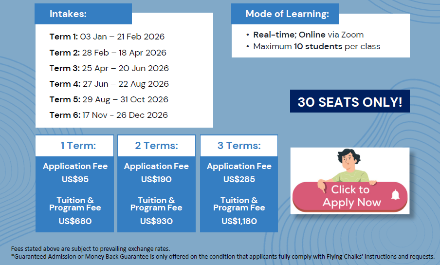 Flying Chalks' Online Korean Language Program with Korea University immerses you in 3 hours of Korean language lessons every Saturday for 8 weeks per semester.