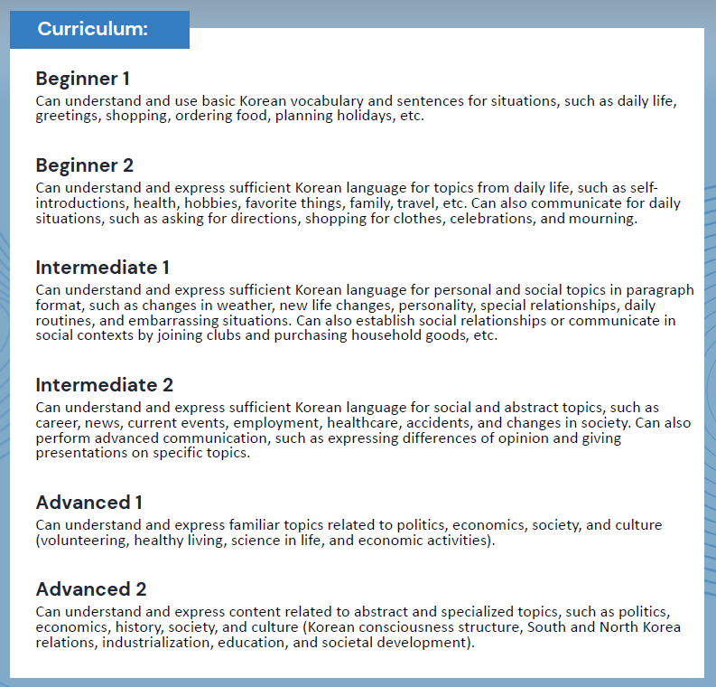 If you have learned Korean before and wish to be placed at a higher proficiency level, you will need to take a placement test. If you are new to learning the language, there is no need for you to take a placement test.