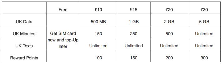 Vodafone UK offers “Vodafone Free SIM” with “Big Value Bundles” that allows you to top-up, earn reward points, and cancel at any time! It functions like a “pre-paid” SIM card.